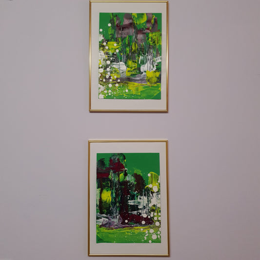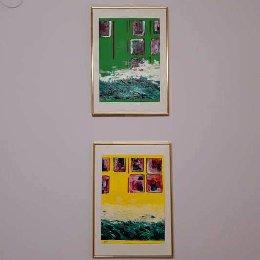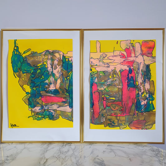Dipinto dittico originale su carta, Ascoltando un rosa Blu